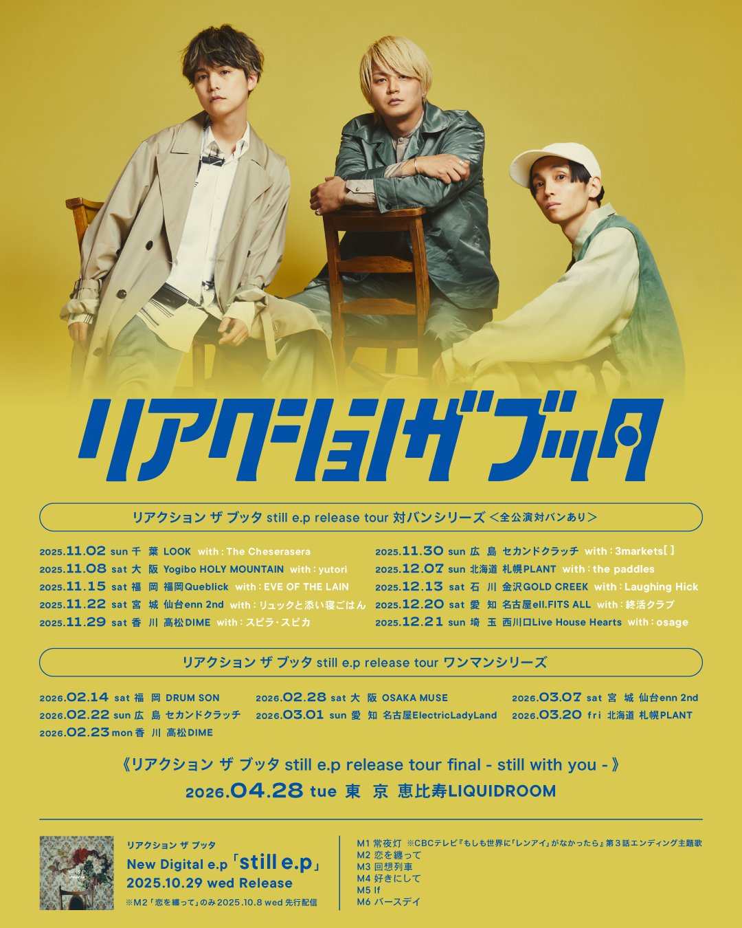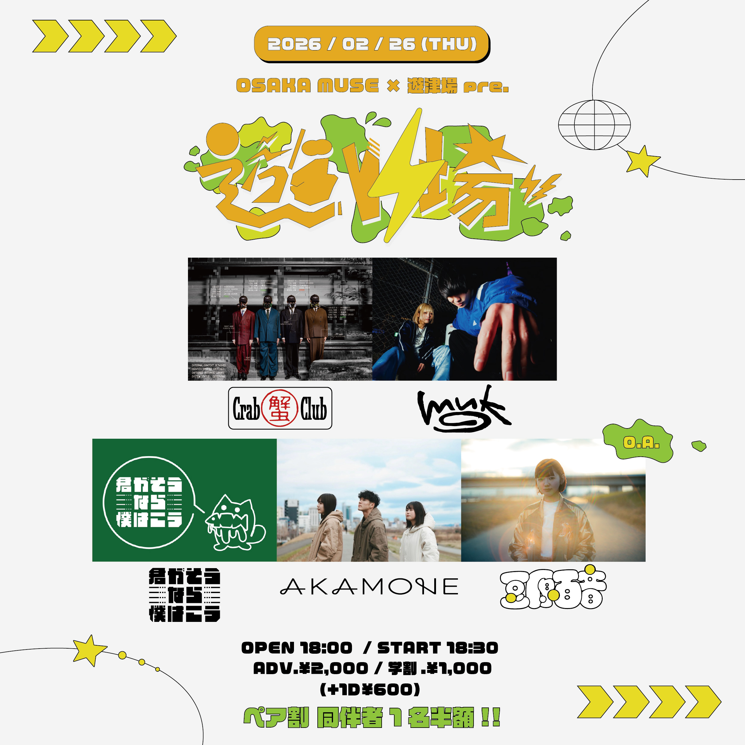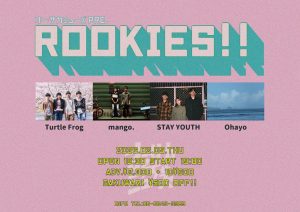 2.05 THU OSAKA MUSE pre. ROOKIES!! Turtle Frog / mango. / STAY YOUTH / Ohayo 学生証の提示で¥500 OFF!! TIMEOPEN 18:30 / START 19:00 PRICEADV.¥¥2,300 / DOOR.¥2,800 入場時ドリンク代別途¥600必要 TICKETアーティスト予約のみ