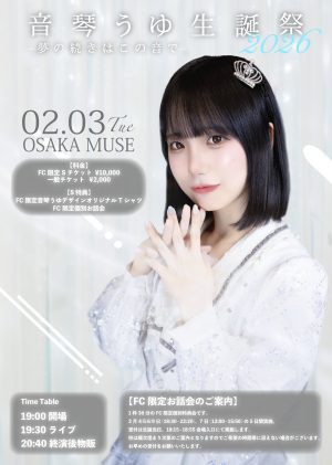 2.03 TUE 音琴うゆ生誕祭2026 -夢の続きはこの音で- リボンのないぷれぜんと TIMEOPEN 19:00 / START 19:30 PRICEFC限定(S)¥10,000 / 一般 ¥2,000 入場時ドリンク代別途¥600必要 TICKET