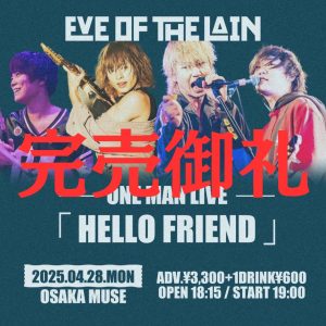 4.28 MON EVE OF THE LAIN ONE MAN LIVE 「HELLO FRIEND」 EVE OF THE LAIN TIMEOPEN 18:15 / START 19:00 PRICEADV.¥3,300 入場時ドリンク代別途¥600必要 TICKET THANK YOU SOLD OUT!!!
