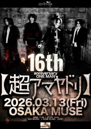 3.13 FRI umbrella 16th anniversary ONE MAN 【超アマヤドリ】 umbrella TIMEOPEN 17:30 / START 18:00 PRICEADV.¥5,000 / DOOR.¥5,500 入場時ドリンク代別途¥600必要 TICKET