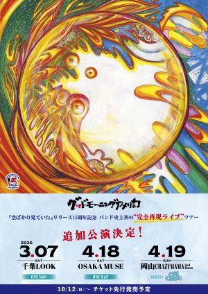 4.18 SAT 『空ばかり見ていた』リリース15周年記念ツアー グッドモーニングアメリカ 問 合 せ:GREENS 06-6882-1224(平日12:00~18:00) https://www.greens-corp.co.jp/ TIMEOPEN 17:15 / START 18:00 PRICEADV.¥4,500 入場時ドリンク代別途¥600必要 TICKET