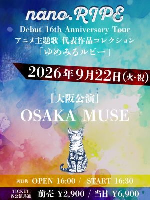 9.22 TUE nano.RIPE DEBUT 16th Anniversary TOUR アニメ主題歌 代表作品コレクション「ゆめみるルビー」 nano.RIPE TIMEOPEN 16:00 / START 16:30 PRICEADV.¥2,900 / DOOR.¥6,900 TICKET 手売りチケット